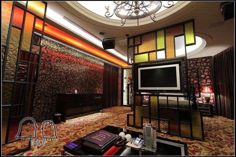 接著看到KTV娛樂室,如圖所見還蠻寬廣的,但跟臥室之間沒有什麼遮蔽。 有大尺寸電視(可以轉向臥室)、KTV設備、還有我也不知道那叫什麼的閃光沙沙棒。