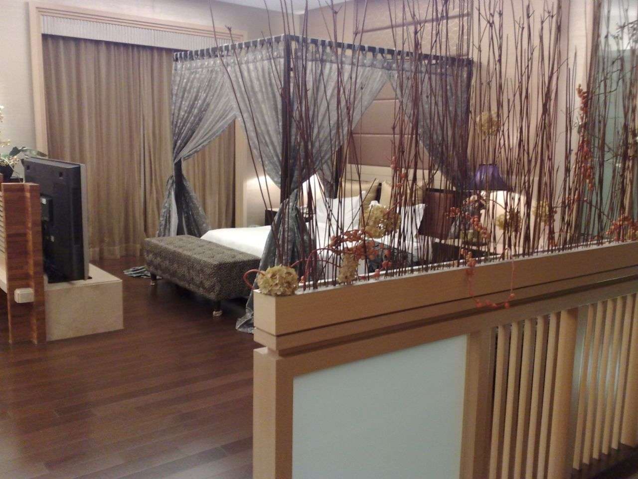步上2樓,因為只開了幾盞小燈,還以為是很暗的房間,後來看了遙控器,發現還有主燈可以打開(這算省電的一種吧),因為不喜歡暗暗的房間,所以很乾脆的將所有燈全開了(也方便拍照^^),果然明亮很多,房間很大,不失高雅,也沒有空洞的感覺,沙發區讓我最喜歡,柔軟的抱枕和地毯,坐在沙發上很舒服,缺點是~電視無法轉向,若是在沙發區吃東西,可能會有點無聊,而且電視櫃感覺很像特別設計過的,所以我也不怎麼計較;公主床很軟,旁邊另外有一張貴妃椅,可能怕牆邊太單調,還特別做了些許花邊設計,點心櫃看起來就比較凌亂,零食部份如果有特別的盒子裝著,感覺會比較好