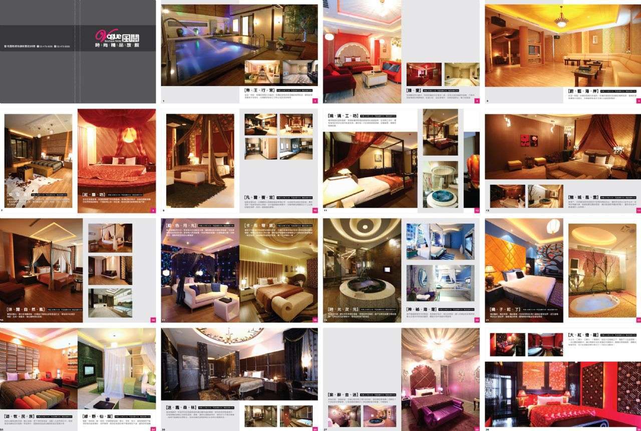 本館首創先例,集合了國內四位精英室內設計師設計了38種不同風格、造景的房型,並不惜重金打造貴賓私人游泳池、冷熱溫泉、維其浴、牛奶浴、戶外涼亭,讓貴賓有如置身各國名勝..其中有用色大膽針對年輕族群的房型..更有溫馨甜蜜的兩人世界..甚至極盡奢華的休閒風!與其他汽車旅館不同的是其他汽車旅館房間數量多.但風格只有7或8種!本館38間房間!卻有38種異國風情!由此可見本館之用心!