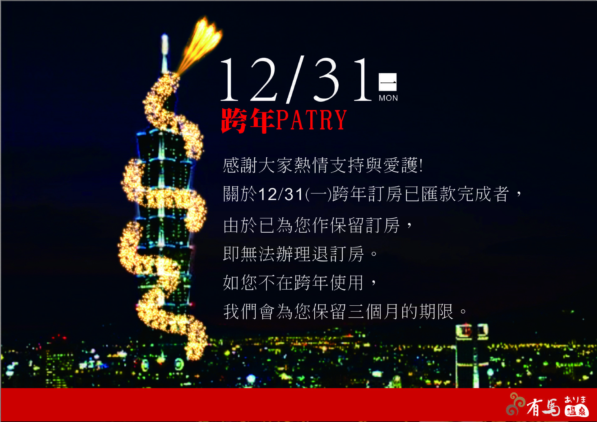 關於12/31(一)跨年訂房已匯款完成者,